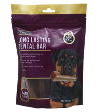 Goodies Long Lasting natural chew bar is a healthy treat for your dog, Suitable for medium and large size dogs. Longlasting Dental bar is a longlasting chewable dog treat that helps clean teeth and gums. Its texture & shape are designed to brush teeth and help reduce plaque and tartar the natural abrasive action of chewing..
