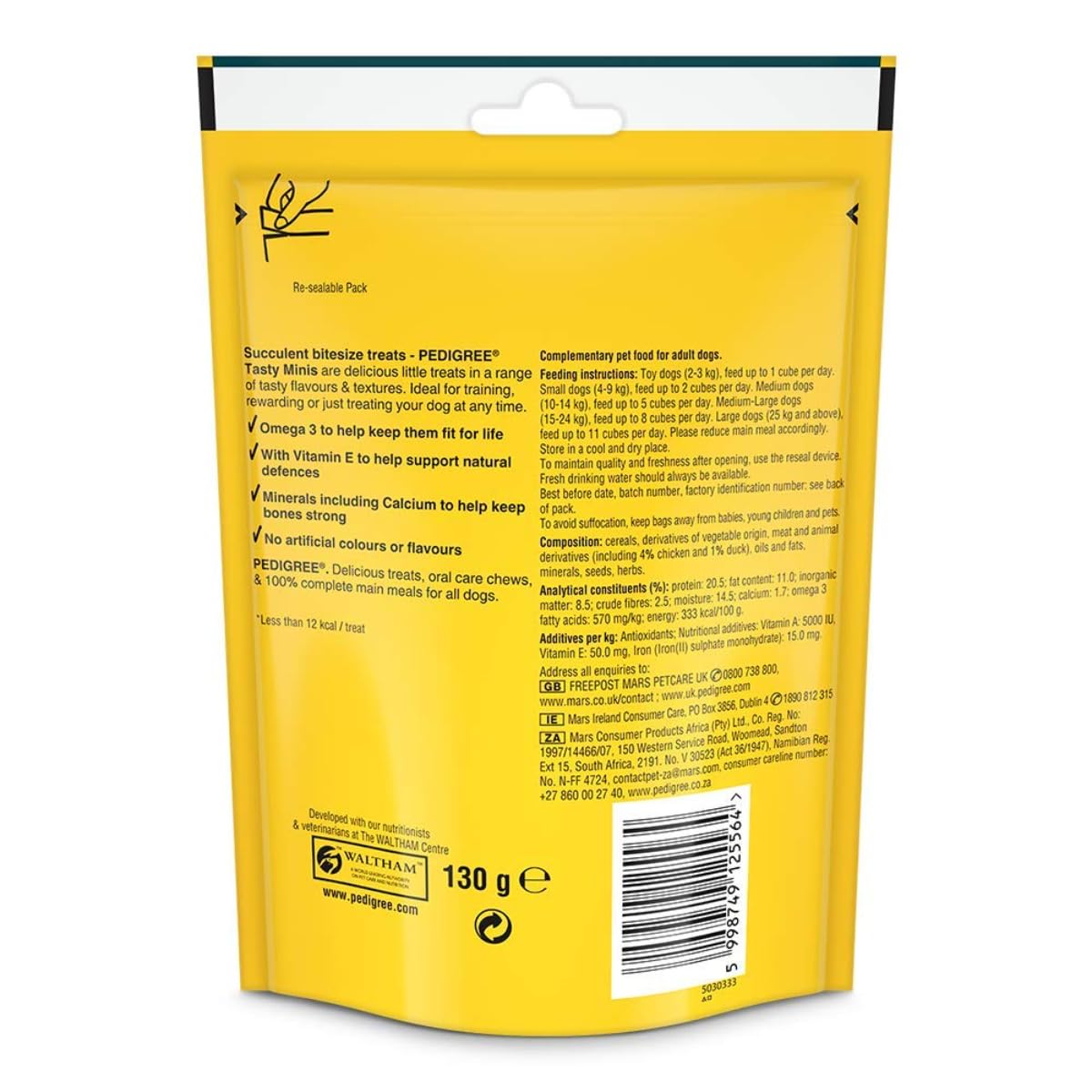• DELICIOUS FLAVOUR: Pedigree Tasty Minis Adult Dog Treat with Chicken and Duck Flavour Chunks, are delicious bitesize treats for dogs